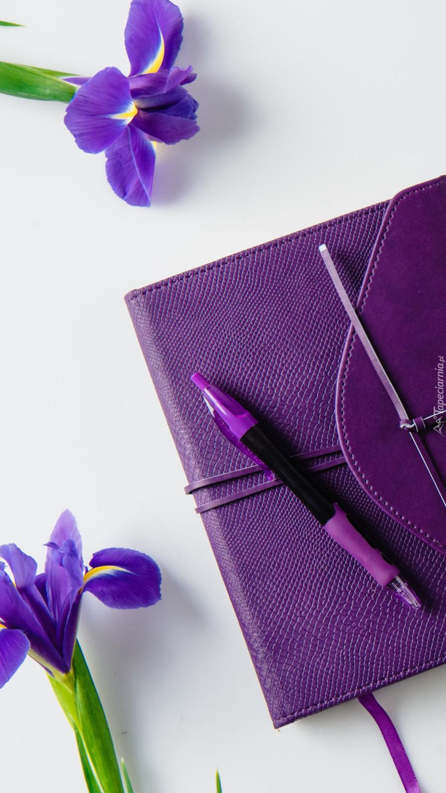 Edytor tapety: Kwiaty irysów obok notesu