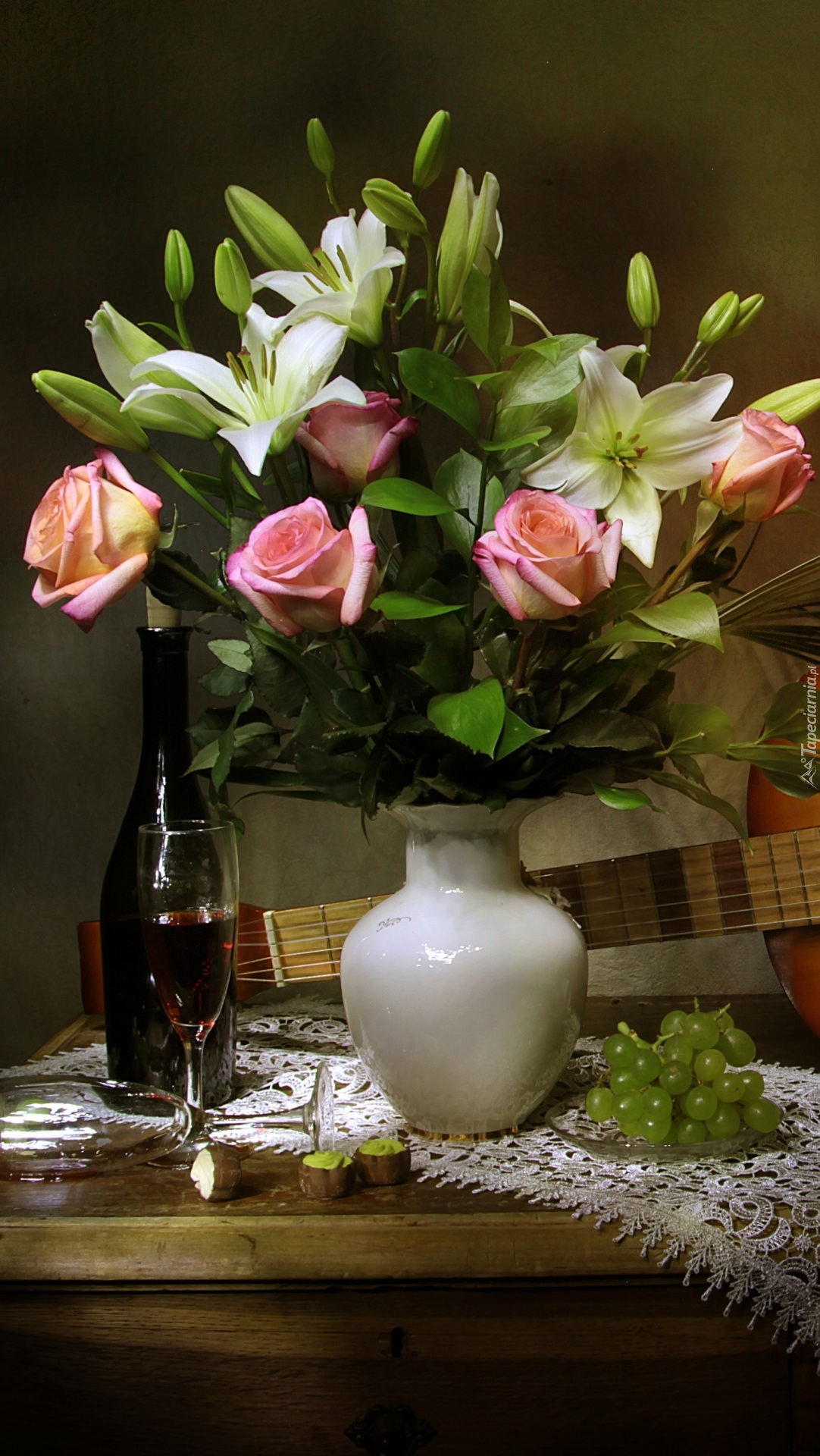 Edytor tapety: Lilie i róże w wazonie