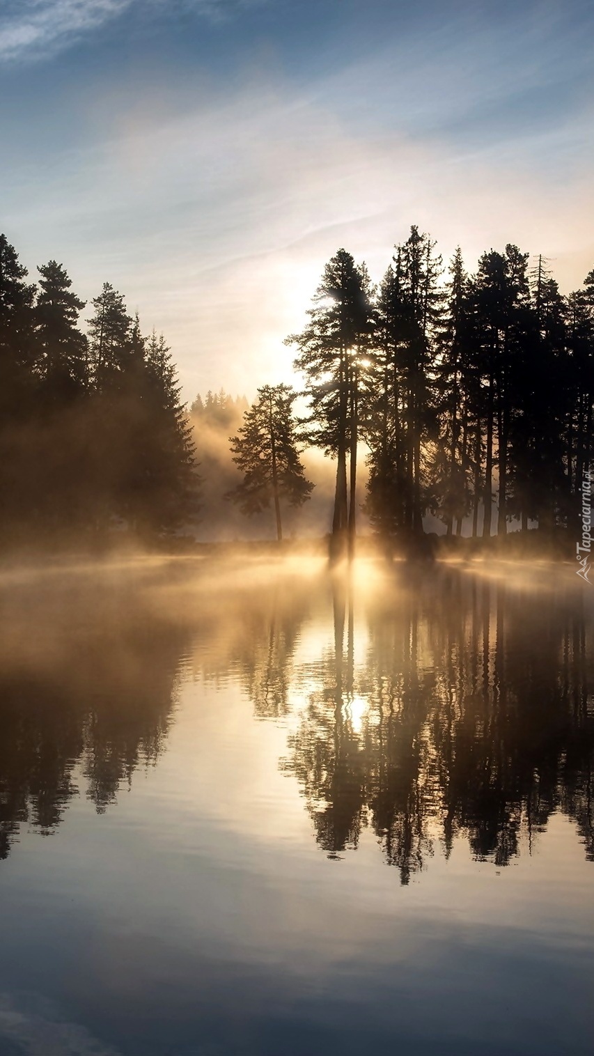 Edytor tapety: Mglisty świt nad jeziorem
