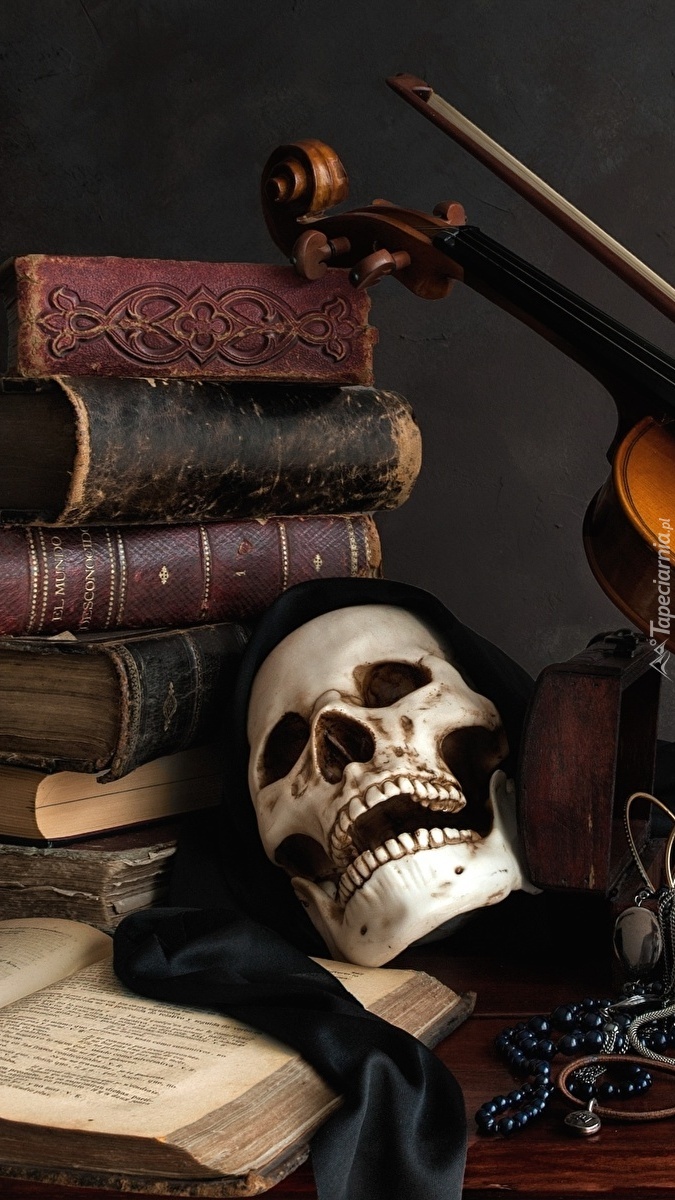 Edytor tapety: Czaszka obok książek