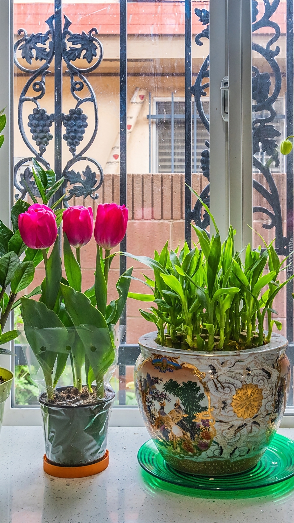 Edytor tapety: Tulipany w doniczce przy oknie
