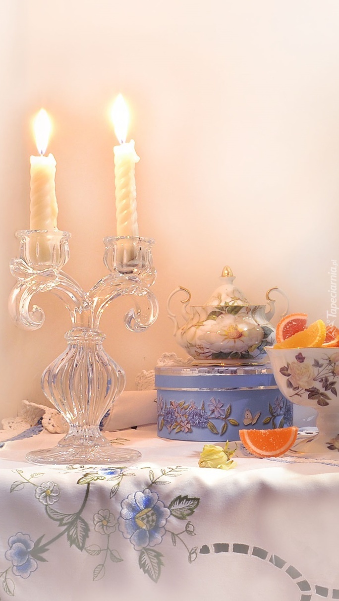 Edytor tapety: Świecznik obok pudełka i owoców