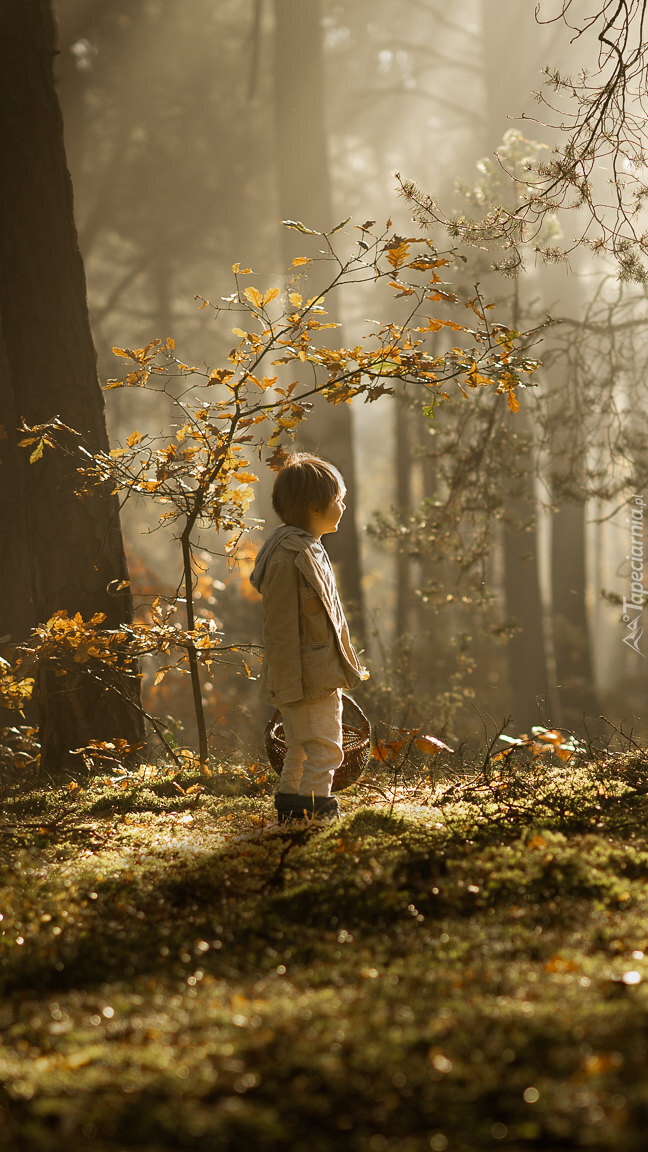 Edytor tapety: Chłopiec z koszykiem w lesie