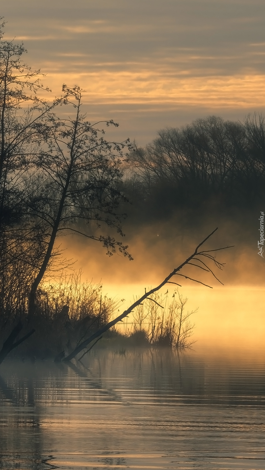 Edytor tapety: Drzewa nad zamglonym jeziorem