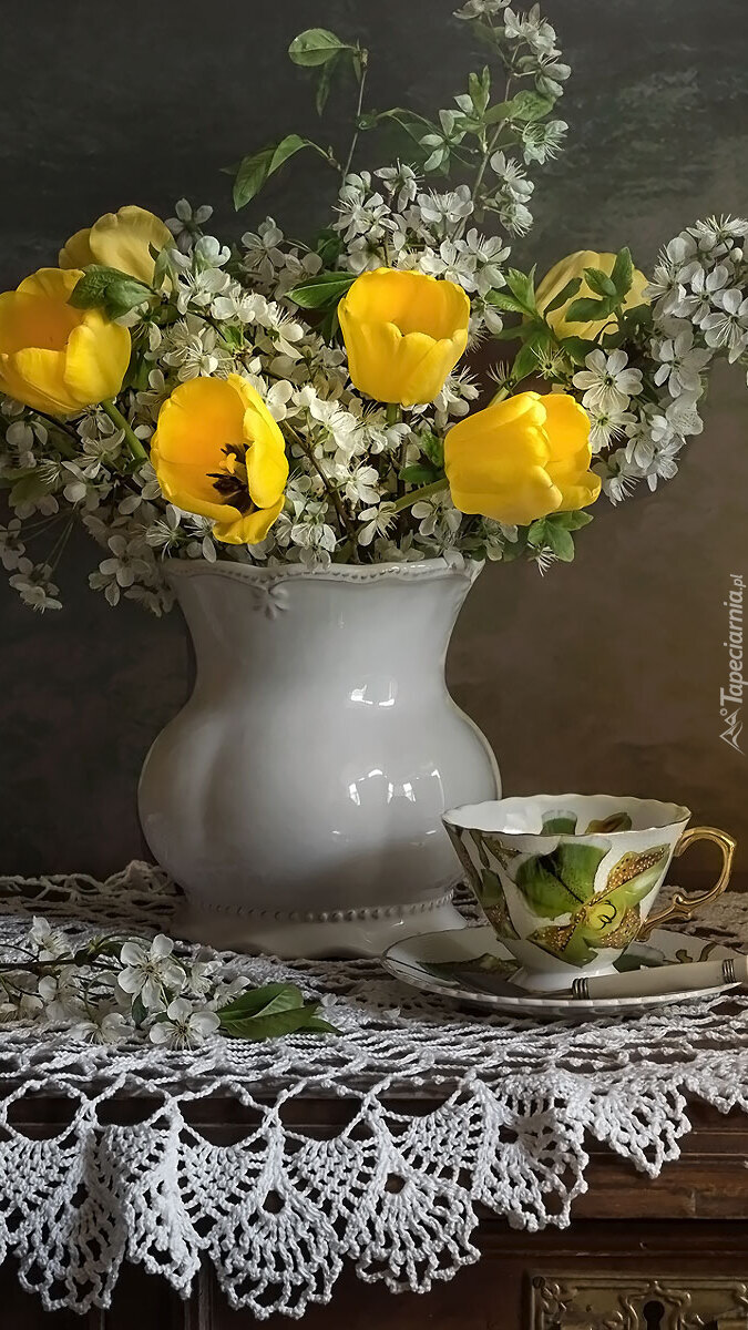 Edytor tapety: Tulipany i okwiecone gałązki w wazonie