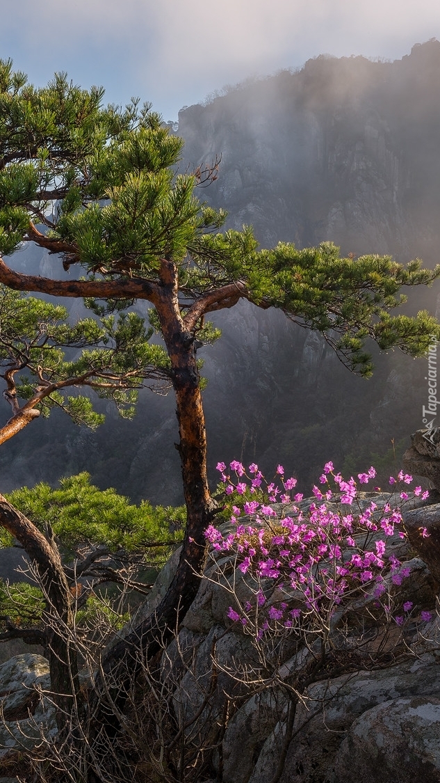 Edytor tapety: Kwitnący krzew pod sosną na skale