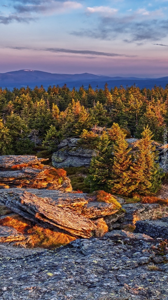 Edytor tapety: Drzewa i skały w porannym słońcu