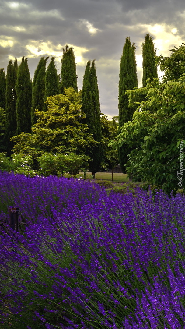 Edytor tapety: Drzewa przy polu lawendy