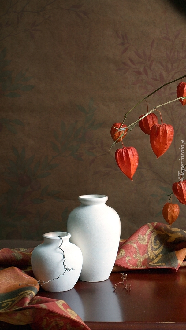 Edytor tapety: Miechunki na gałązce przy wazonach