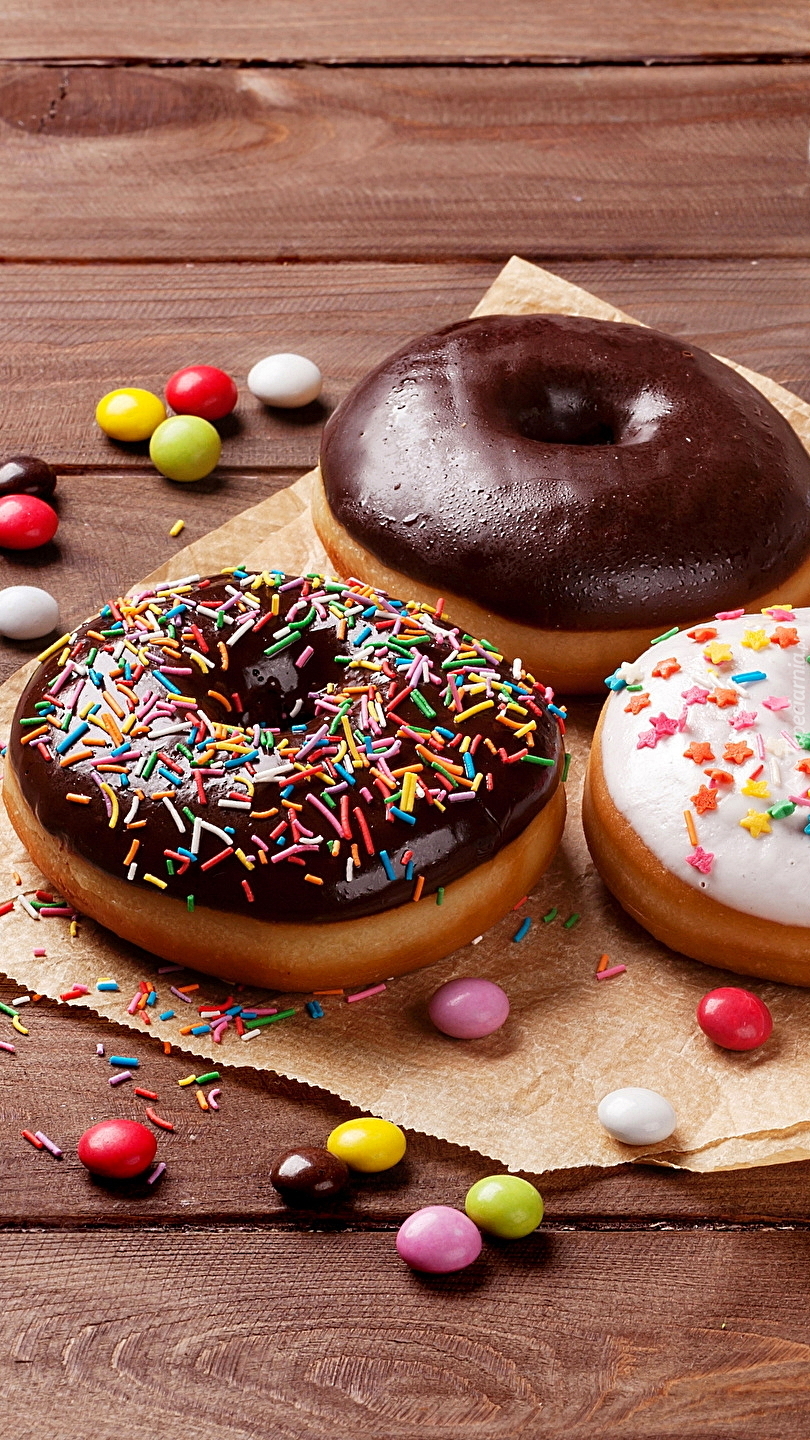 Edytor tapety: Trzy donuty i małe cukierki