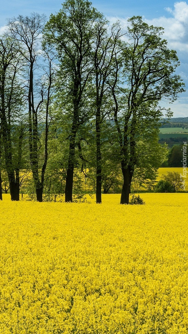 Edytor tapety: Wysokie drzewa na polu rzepakowym