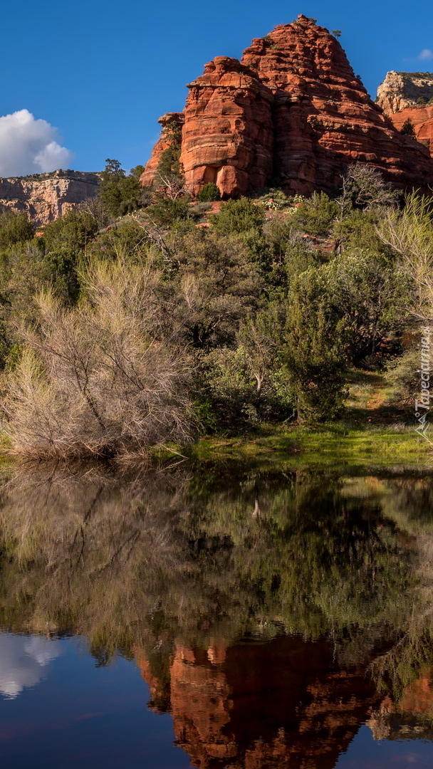 Edytor tapety: Czerwone skały nad jeziorem