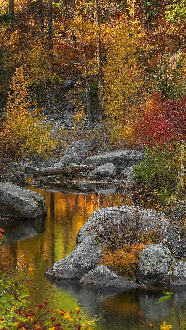 Edytor tapety: Kamienie i kolorowe krzewy nad rzeką