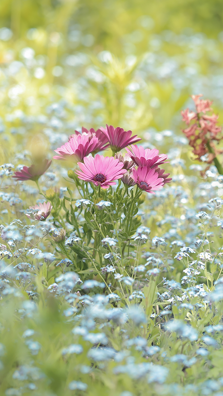 Edytor tapety: Stokrotki afrykańskie wśród niezapominajek