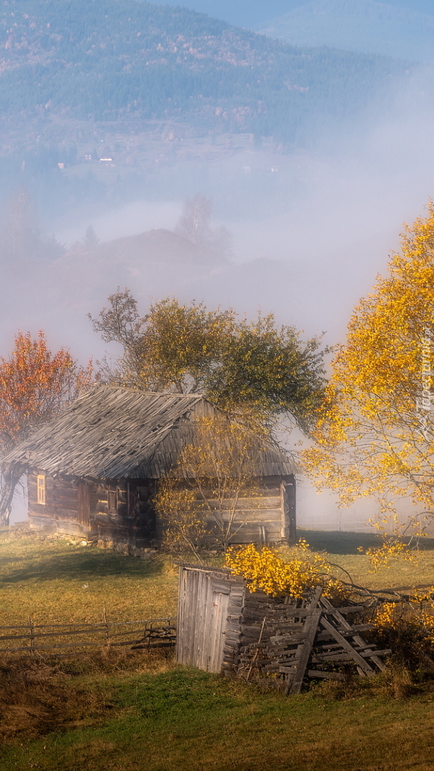 Edytor tapety: Drewniany dom pod jesiennymi drzewami