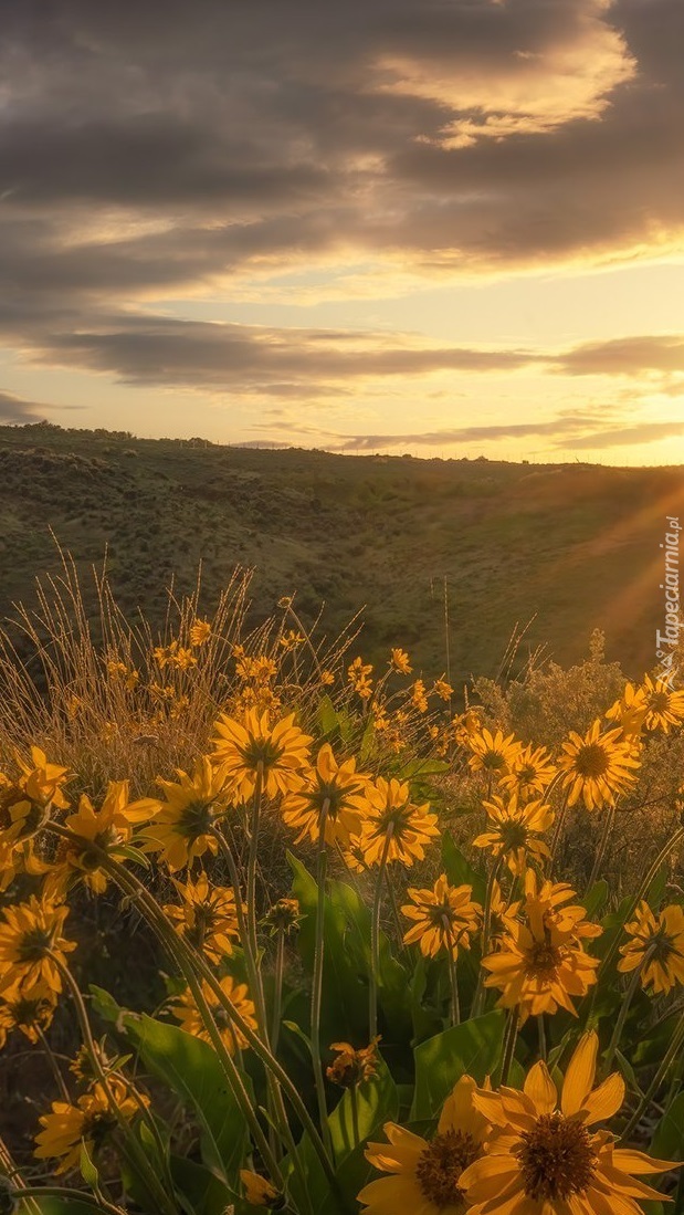 Edytor tapety: Balsamorhizy na łące o wschodzie słońca