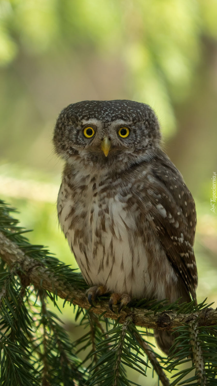 Edytor tapety: Sóweczka zwyczajna na gałęzi świerku