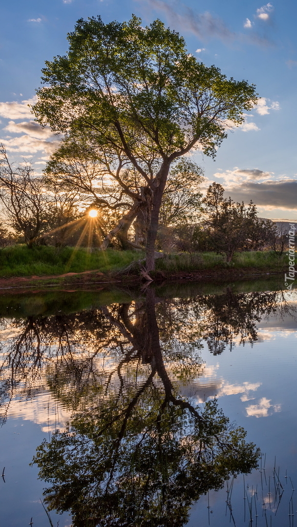 Edytor tapety: Odbicie drzewa i chmur w jeziorze