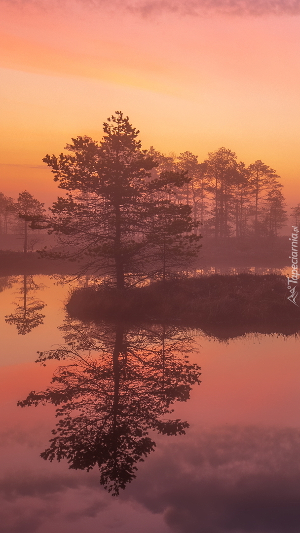 Edytor tapety: Drzewa nad zamglonym o poranku jeziorem