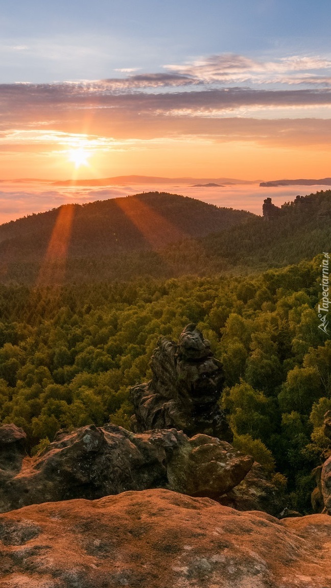 Edytor tapety: Wschód słońca nad zalesionymi górami