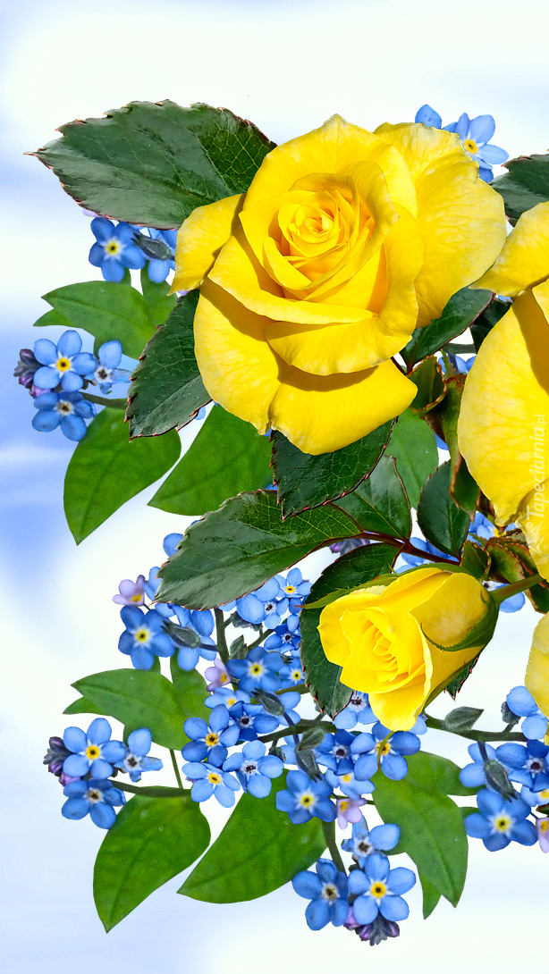 Edytor tapety: Żółte róże i niezapominajki w 2D