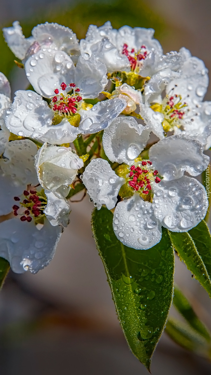 Edytor tapety: Zroszone białe kwiaty na gałązce