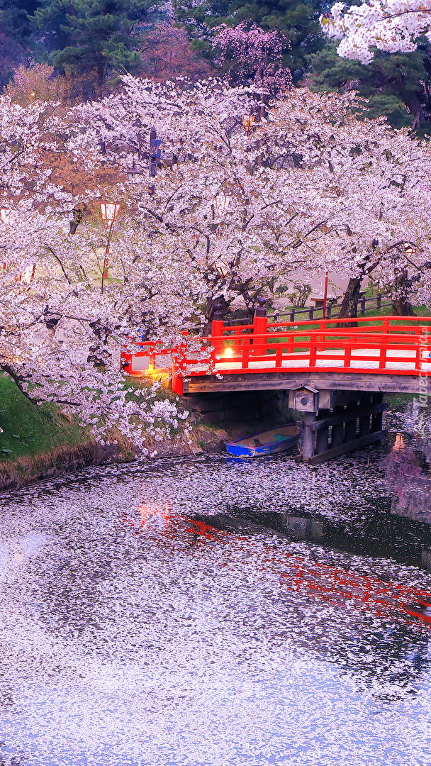 Edytor tapety: Kwitnące drzewa przy moście