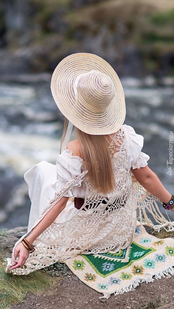 Edytor tapety: Kobieta w kapeluszu siedząca na skale