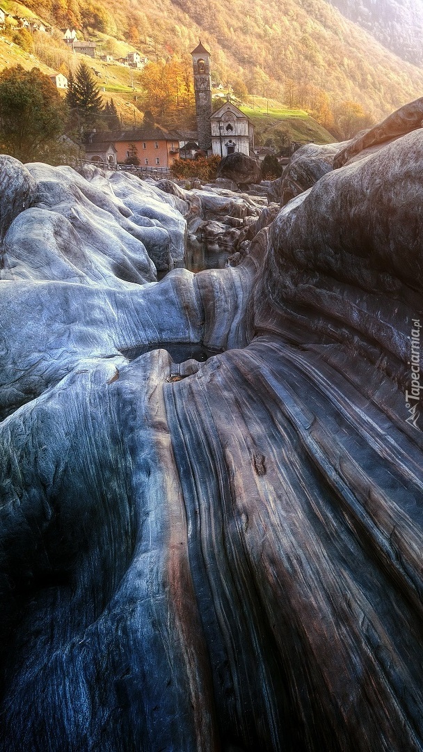 Edytor tapety: Kościól przy skałach na rzece Verzasca