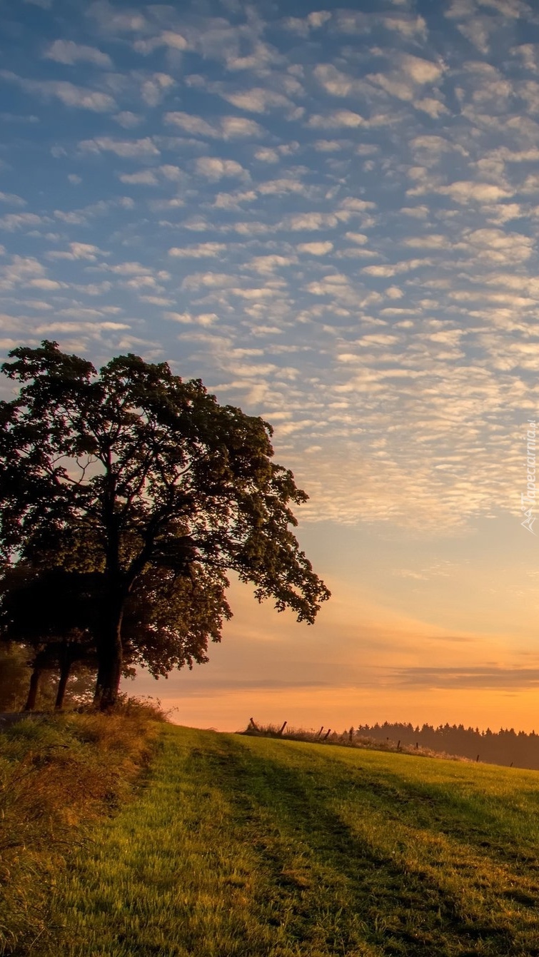 Edytor tapety: Drzewa na łące w zachodzącym słońcu