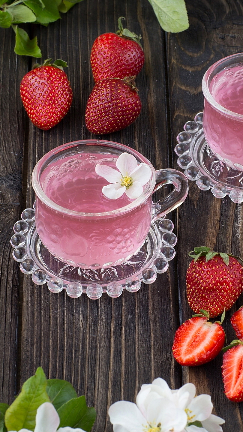 Edytor tapety: Truskawki obok napoju owocowego w filiżance