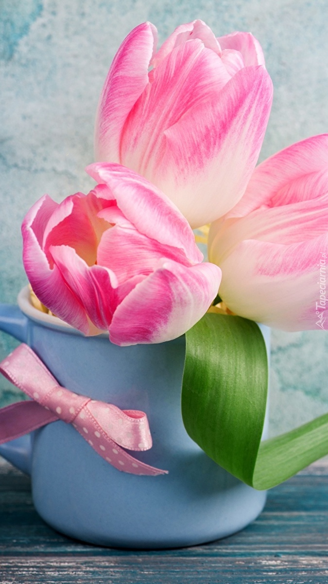 Edytor tapety: Trzy tulipany w niebieskim kubku