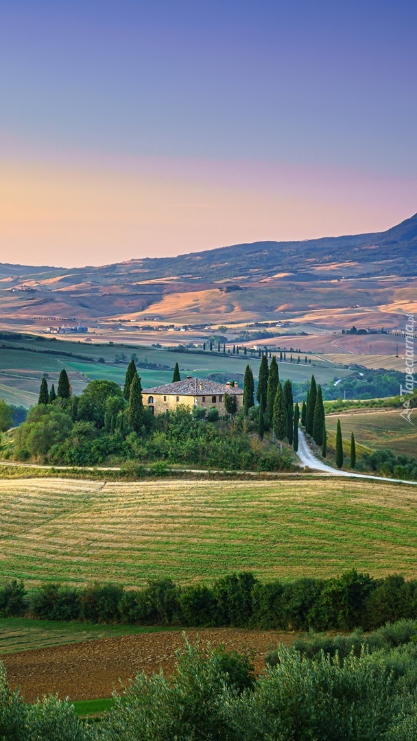 Edytor tapety: Pola uprawne obok domu w Toskanii