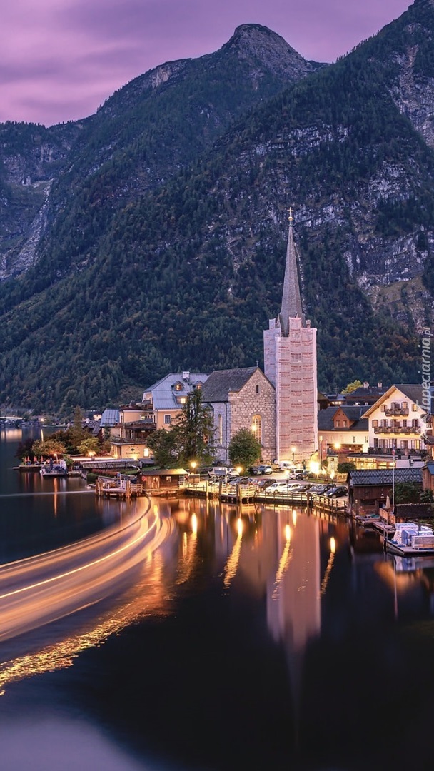 Edytor tapety: Oświetlone domy nad jeziorem Hallstattersee
