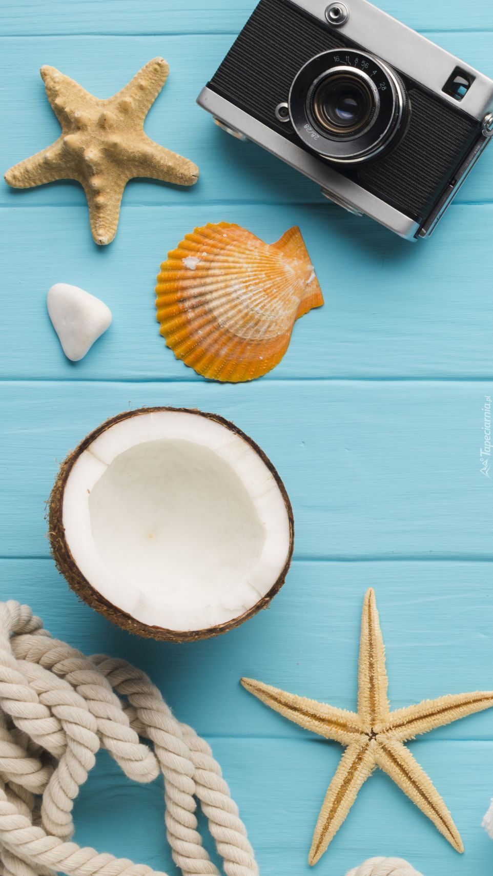 Edytor tapety: Aparat fotograficzny obok muszelek i kokosu