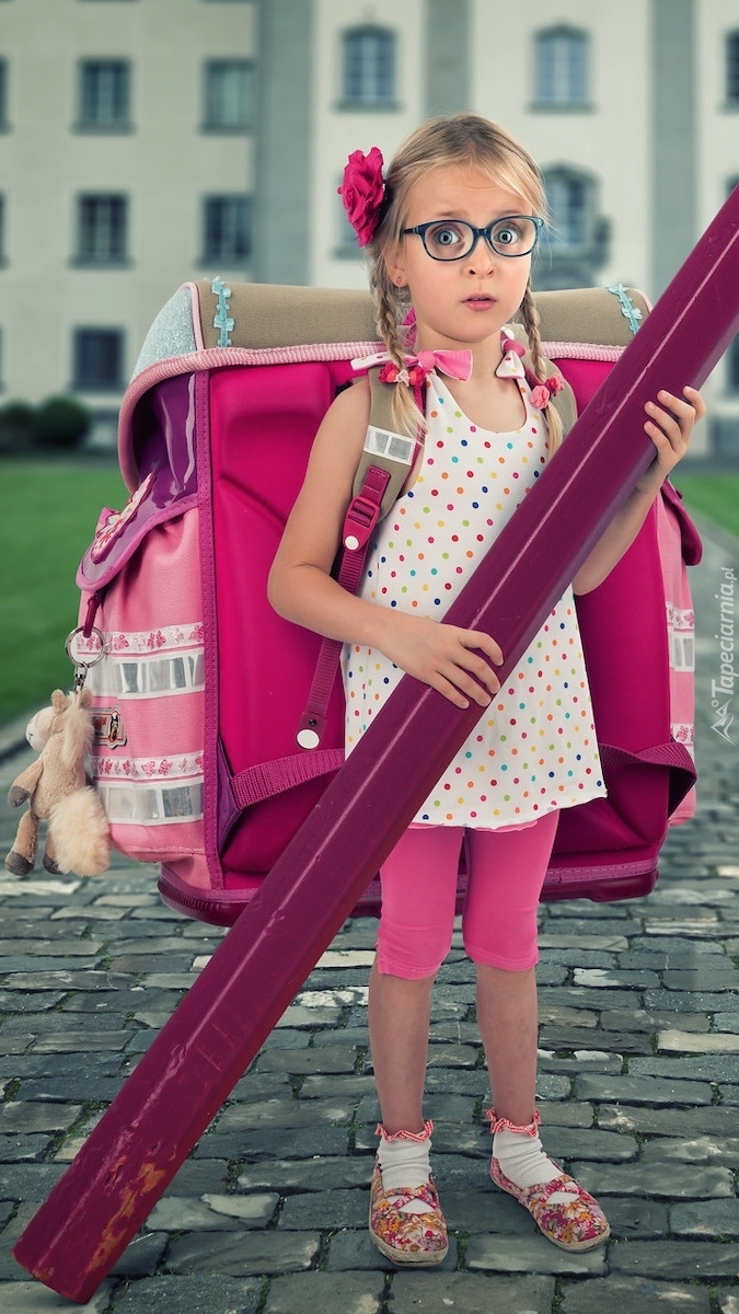 Edytor tapety: Dziewczynka z ogromnym tornistrem i ołówkiem