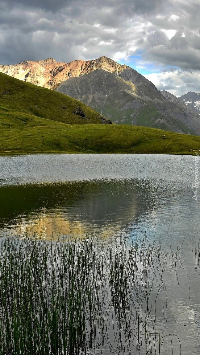 Edytor tapety: Rozświetlone góry nad jeziorem