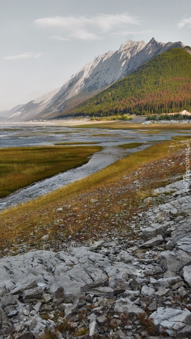 Edytor tapety: Skały na brzegu jeziora w górach