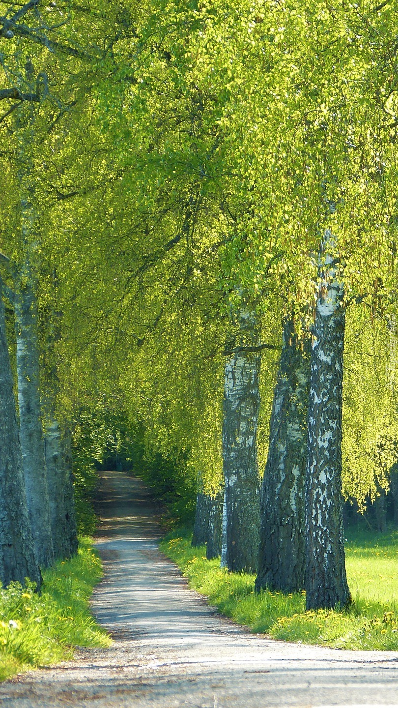 Edytor tapety: Rozświetlone brzozy przy drodze