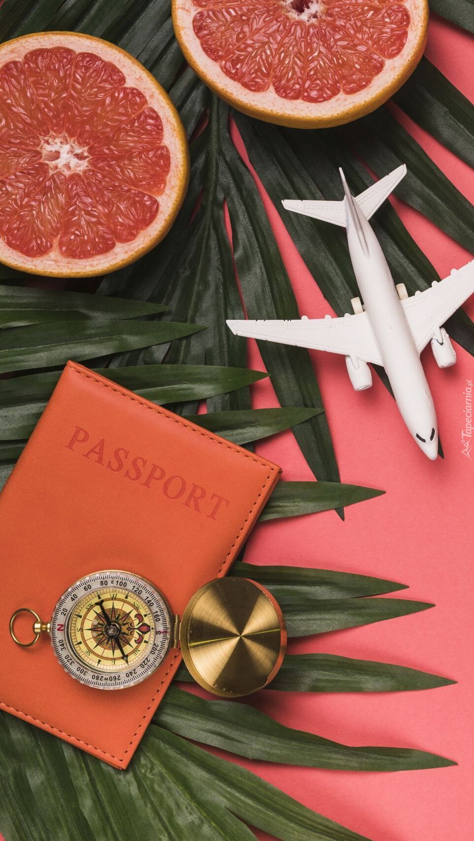 Edytor tapety: Paszport i miniaturka samolotu na liściach