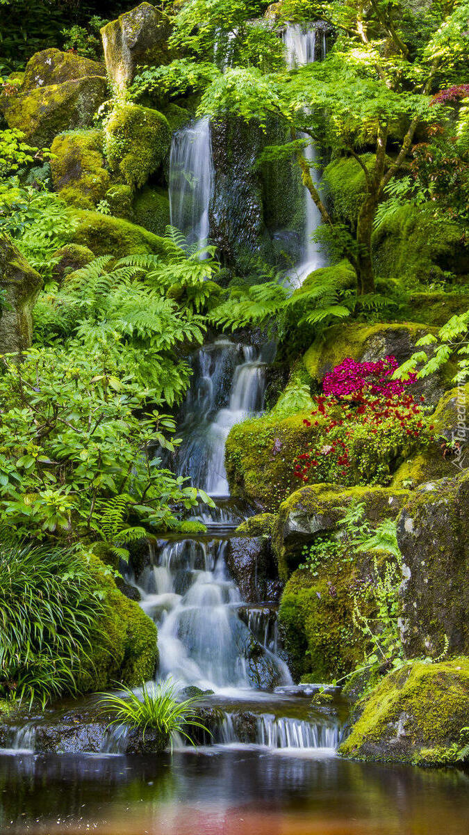 Edytor tapety: Wodospad na skałach wśród roślinności