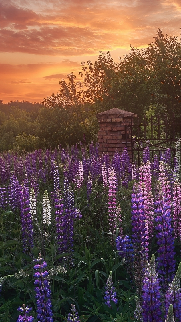 Edytor tapety: Łubin i drzewa przy ogrodzeniu