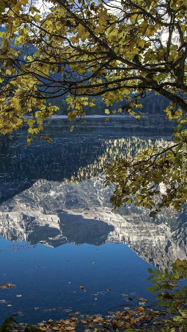 Edytor tapety: Gałęzie nad jeziorem i odbicie gór