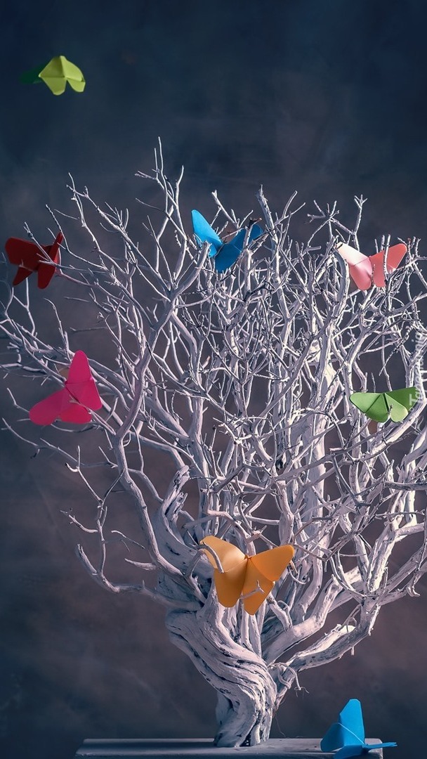 Edytor tapety: Papierowe motyle na suchym drzewku