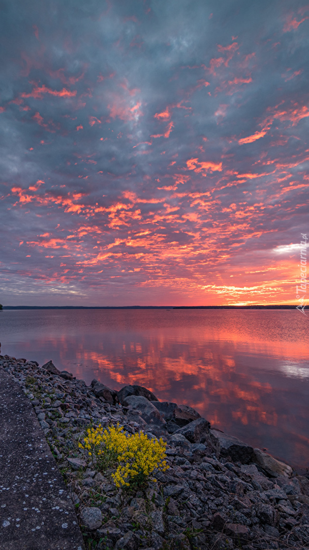 Edytor tapety: Kolorowe niebo zachodzącego słońca nad jeziorem