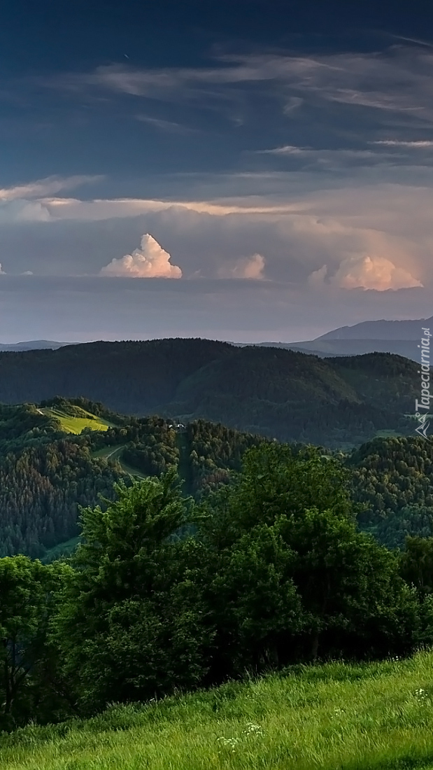 Edytor tapety: Widok z zielonej łąki na góry