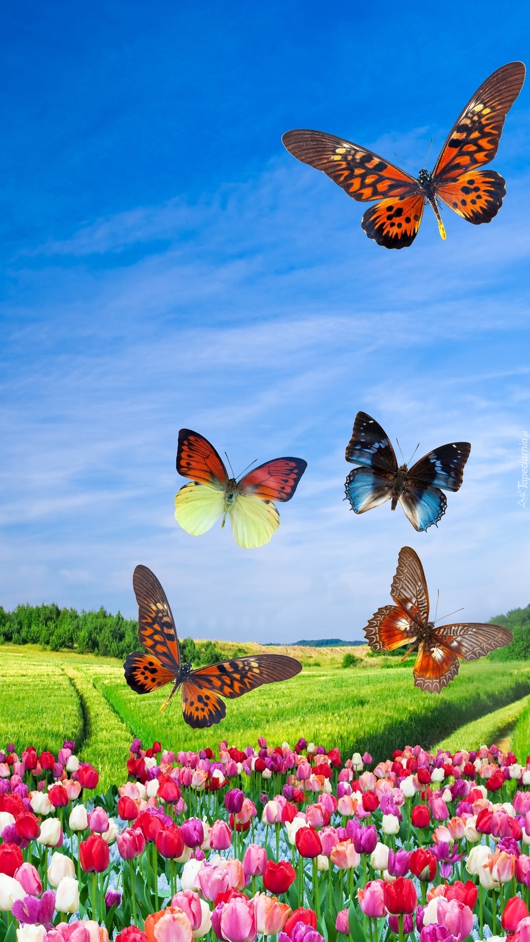 Edytor tapety: Kolorowe motyle nad tulipanami w 2D
