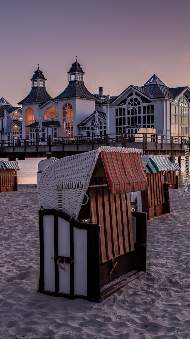 Edytor tapety: Kosze plażowe przy molu z restauracją