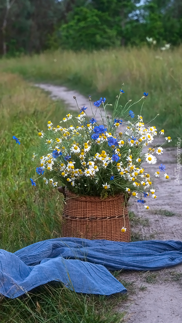 Edytor tapety: Kosz z kwiatami przy polnej ścieżce