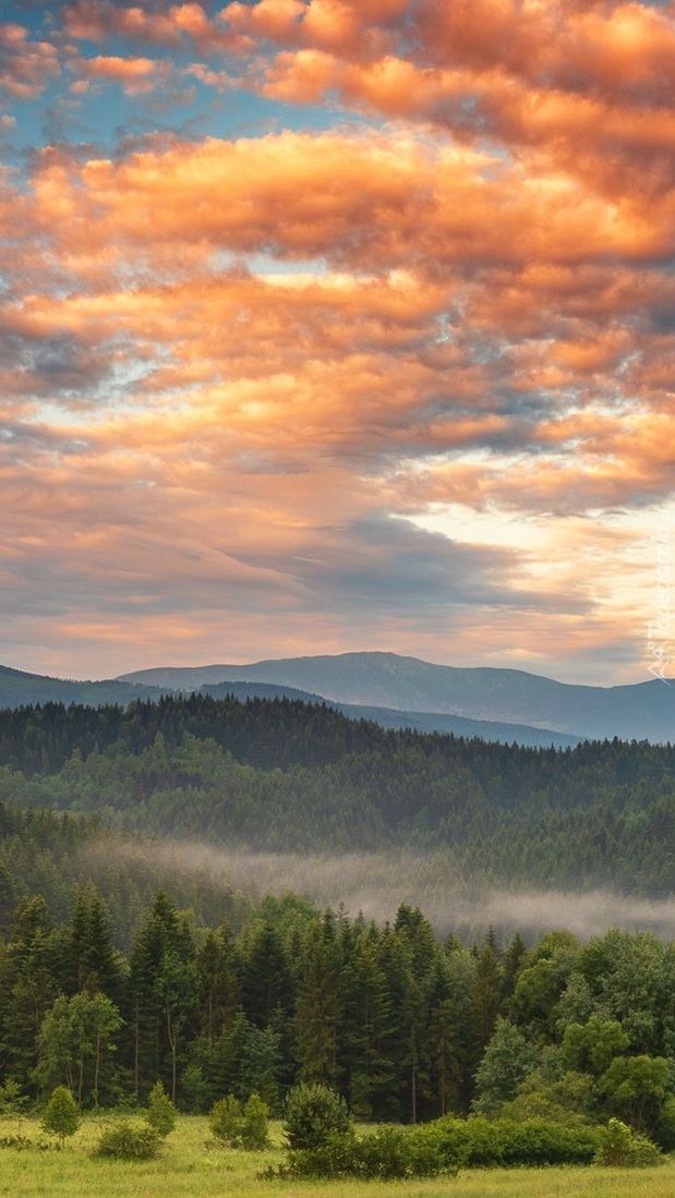 Edytor tapety: Kolorowe chmury nad górami i lasem